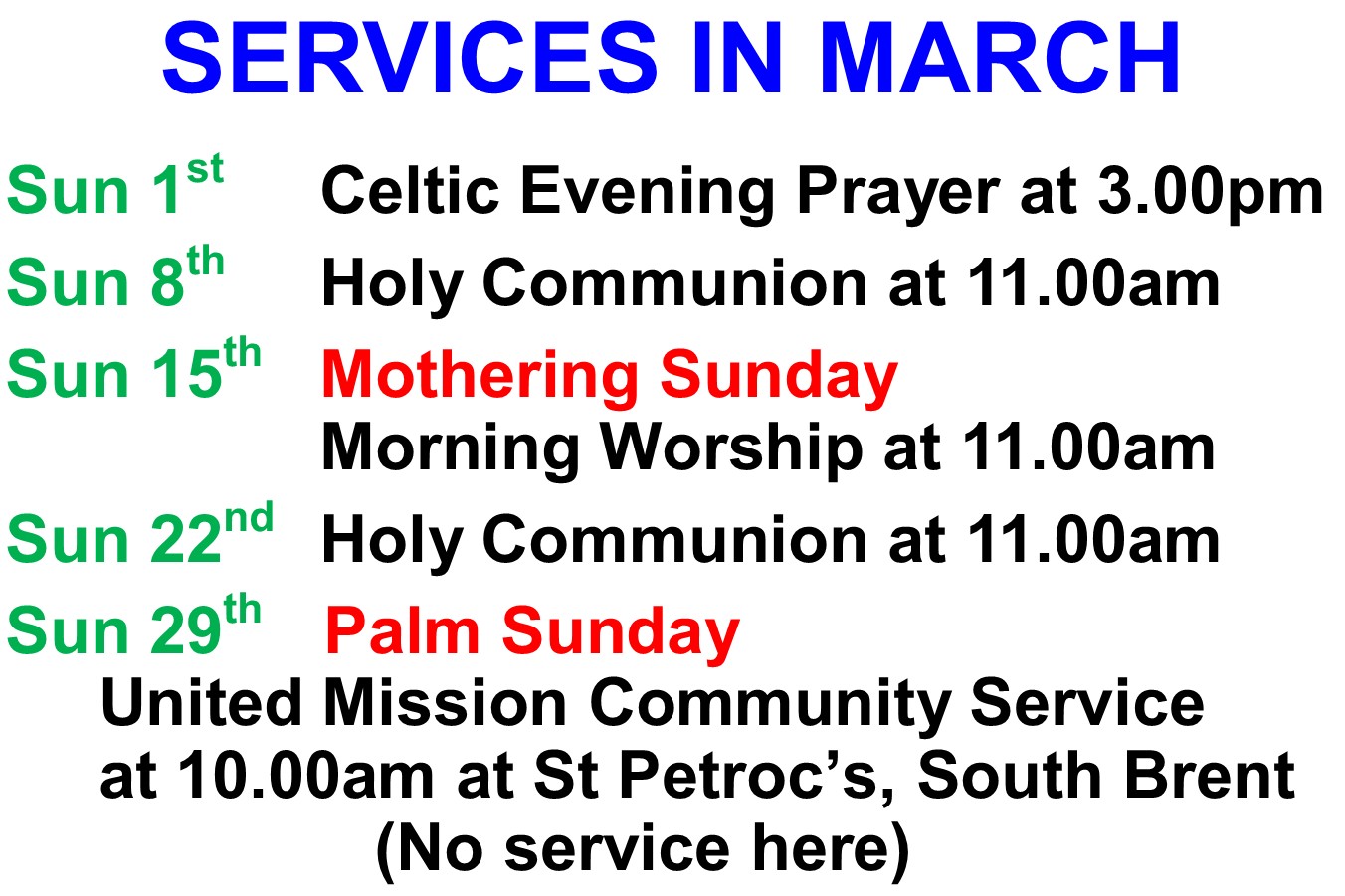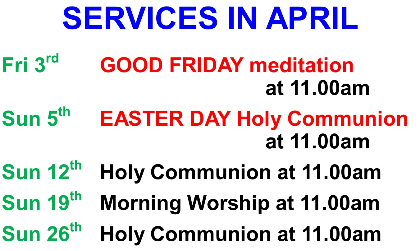 There is a morning service in church at 11.00am on the 2nd, 3rd and 4th Sundays of the month